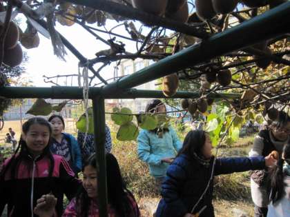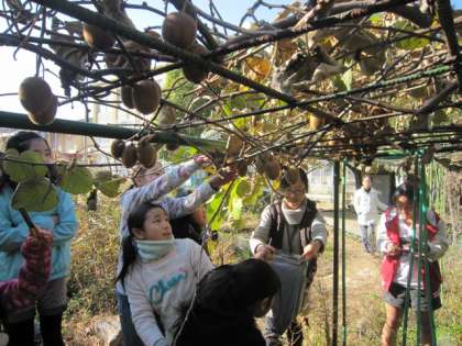 ビオトープのキウイが、たわわに実っていました。今日、料理クラブの子どもたちがジャム作りをするために、キウイの収穫をしてくれました。収穫し始めるとあっという間に段ボールがいっぱいになり、総数220個のキウイが収穫されました。