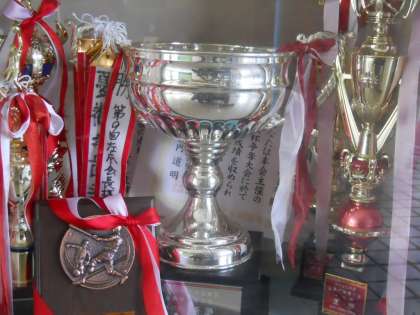 玄関入ったところに、トロフィーやカップが飾ってあります。