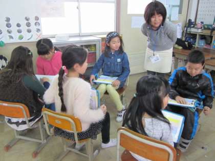 動物園の動物たちが好きな野菜を知って、自分たちもどんな野菜が好きかを調べる学習でした。子ども同士で英語でやりとりをするので、保護者英語ボランティアの方にも来ていただきました。自分たちでやりとりをした後、和田獣医さんのところへ行って、また、英語でやりとりをします。