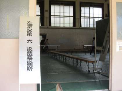左京区第六投票区投票所の準備に,午後1時から,選管の方々や地域の方々が集まられ,重いリノリュームを体育館一面に敷き詰められました。重労働で,大変ですが,皆様のお力で,手際よくされています。