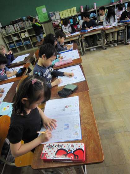 第2学年の教室に入り,担任の先生と,正しい鉛筆の持ち方ができているかを調べました。みんな,しっかりとできています。