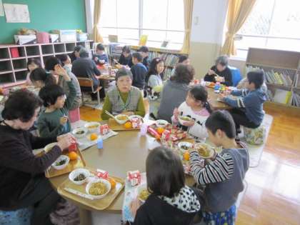 3年1組のすこやか給食は、地域の高齢者の皆さんといっしょに給食を食べながら、昔のことをたくさん教えていただきました。昔は食べ物が質素であったこと、昔の道具や遊びについてなど、たくさんのことをお話してくださいました。今日は台風献立でしたが、おいしくいただきました。ありがとうございました。