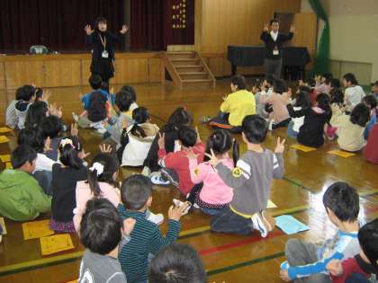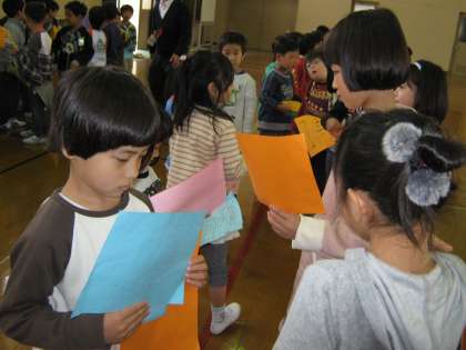 生活科の授業で,二年生のお兄さん,お姉さんと交流学習をしました。自己紹介をして,一緒にゲームをしたり,踊ったりしているうちに自然に仲良くなっている姿がみられました。来週の遠足,一緒に行くのがとても楽しみになったようです。