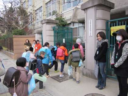 いつものようにPTAの本部役員の皆さんは、校門前で子どもたちを出迎えてくださいました。また、保護者の方も、集団登校について来てくださいました。