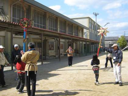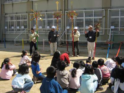 午後の授業では,剣鉾を体験しました。歩き方で音が鳴る剣鉾に興味津津の子どもたち。我先に剣鉾をもって歩こうとしていました。重い剣鉾をもって頑張って歩いている子どもたちの真剣さ・ひたむきさが胸を打ちます。これからも京都に伝わる伝統文化を体験し継承してもらいたいと思います。