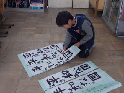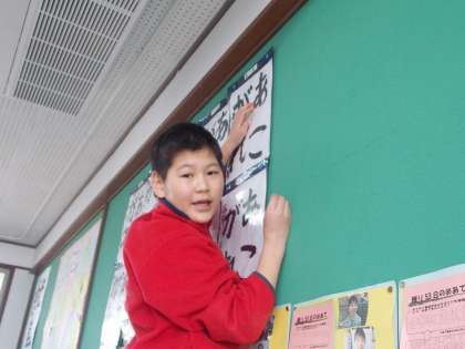 友達の作品などを教室後ろの掲示板や、階段の所にある掲示板などに飾ることが仕事です。押しピンを押すのが意外と硬く難しいようですが、工夫をして頑張っています!えらい!