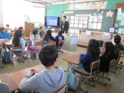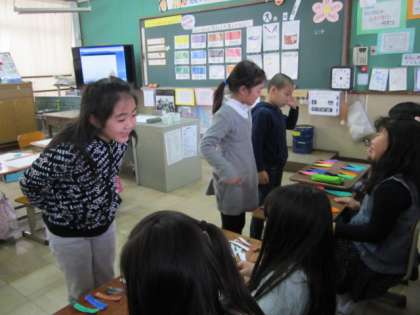 総合的な学習の時間で調べてきた「剣鉾」と「和太鼓」を英語でも使いました。友達とやりとりをして、剣鉾と和太鼓のミニチュアをつくりました。