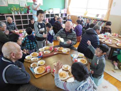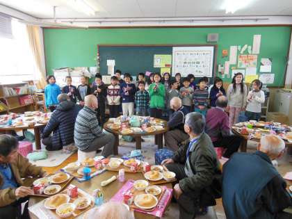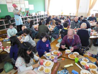 すこやか給食がありました。社会科の時間に,七輪や洗濯板を使って学習したことを地域の方に話しながら,実際の昔の地域の様子や生活の様子などをいろいろと教えてもらいました。昔は,お米はなかなか食べることができなかったことや火をおこす時のエピソードなど,実体験を話していただいたので,学習をしているところでもあるので興味心身に話を聞いていました。