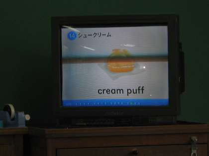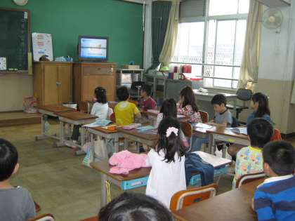 「バナナじゃなくて,banana」「ピザじゃなくて,pizza」などチャンツに合わせてリズミカルに英語を発話しています。何事にも意欲的な2年生。「先生,もっと難しいのも言ってみたい」との声もあがっています。コンピュータの画面を消すとき,誰かが "See you."と言ったのをきっかけに,今では誰もが思い思いに”See you." "Bye-bye."などと自然に英語を使う場面もあり,ますます楽しくなっています。