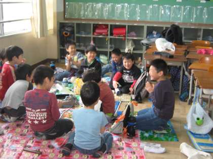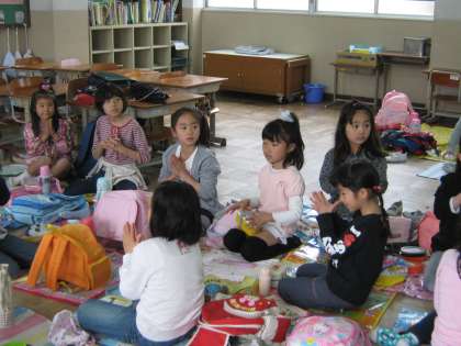 ポジティブなというか,気持ちの切り替えのよさというか,感心しました。お昼になってお弁当をいただくときには,「やっぱり つくえじゃなくて シートを広げて食べたいな」ということになり,1組も2組もそれぞれ教室いっぱいにシートを広げてお弁当を楽しくいただきました。お家の方の愛情いっぱいのお弁当,どの子もニコニコ笑顔でした。