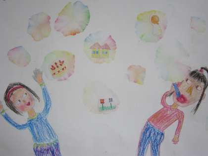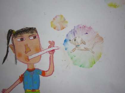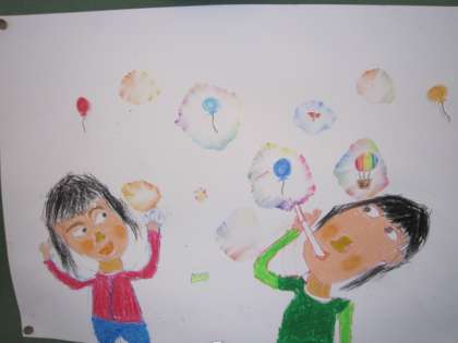 子どもたちが綺麗なシャボン玉に写る好きなものと,自分と友達とで楽しく遊ぶ空想の世界を絵に描いています。
