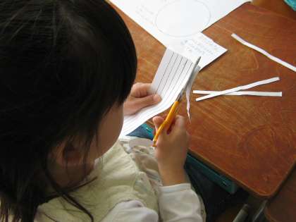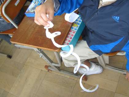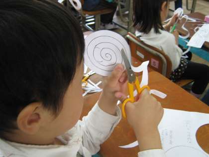 まずは,まっすぐの線の上を切って,おそばを作りました。そして,次に「りんごのかわむき」と題して,ぐるぐるまきをチョキチョキ切っていきました。「途中できれちゃった。」という子や「最後まで切れたよ。」とうれしそうにいう子もいました。