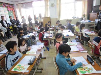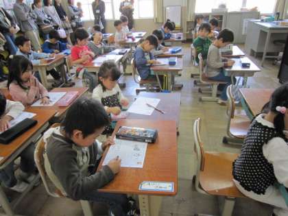 今日の参観授業は,国語科で,まずは,「か」の文字を書く学習で,はじまりました。そして,単元「うたにあわせてあいうえお」という学習が続きます。授業が進むに連れ,子どもたちは,教師の問いかけに,積極的に関わっていきます。