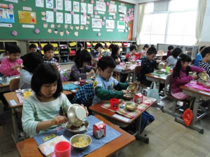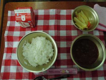 13日は、ハッシュドビーフとジャガイモのソテーでした。どちらも子どもたちに人気のメニューです。1年生も初めての給食に大満足の様子でした。