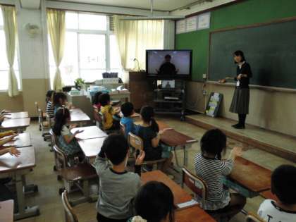 昼学習の時間に“Hello song”という英語の歌を歌っています。