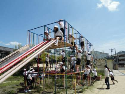 休み時間の総合遊具は、にこにこ笑顔の2年生でいっぱいです。