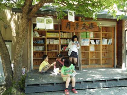 ビオトープでは、月澤文庫の前で、読書に熱中する子。