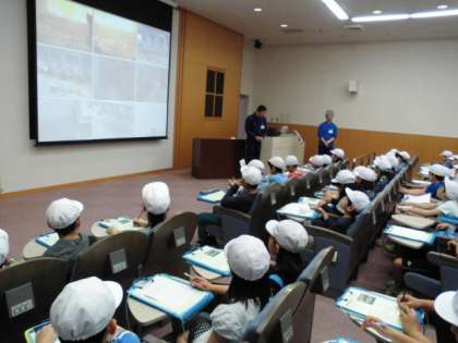 施設内では,DVDを見ながらクリーンセンターの仕事について教えてもらったり,京都市のごみ処理の仕方について学習しました。その後,実際に施設内の機械を見せていただくと,クレーンやつめなどの大きさに唖然としていました。