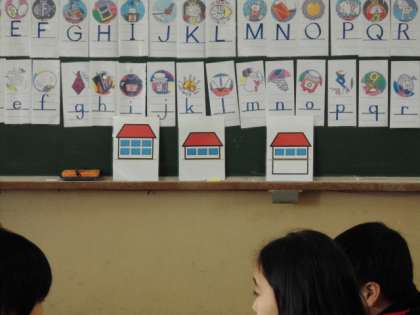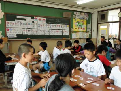 小文字を習う時間です。大文字は5年生の時に学習しています。どちらかといえば、大文字のほうがなじみやすいかと思いますが、よく工夫された授業で、楽しみながら、大文字と小文字の違いに気付いていました。