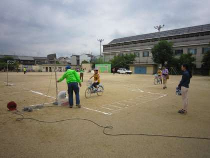 親子自転車安心安全教室がありました。雨が降り実施が危ぶまれましたが,なんとか雨もやみ,早朝より地域の方・PTAの方にお世話になり準備をしていただきました。コースも水たまりをよけ,いいコースを準備していただきました。子どもたちもできるかどうか心配だったと思いますが,外でできてうれしそうでした。保護者の方にも実際に走行練習をしていただき,親子で自転車の乗り方について学ぶ,よい機会となりました。