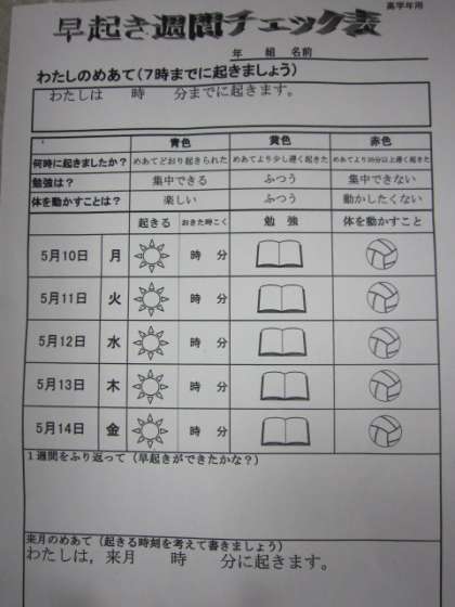 今年も,早起き運動を実施します。月初めの1週間を,「早起き週間チェック表」に自己評価させ,統計をとっていき,早起き運動の成果を見ていきたく存じます。