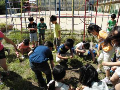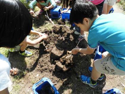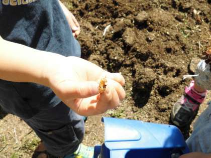 土の中から、虫の幼虫が出てきてびっくり!小さな幼虫に大騒ぎの子ども達でした。