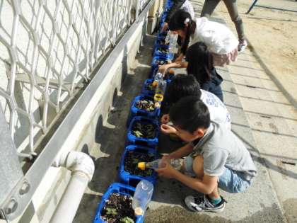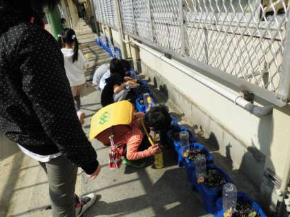 先週まいたアサガオの芽が月曜日に出ました。全員の芽が出て,みんな大喜びです。毎朝熱心に水やりしています。生活の時間には,出た芽の絵をかきました。