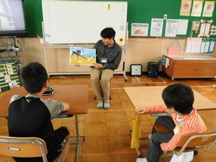 昼学習では,いつもはパワーポイントで聞いている英語の絵本を,今日はウィル先生に読んでもらいました。