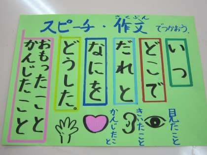 スピーチをするときのヒントカードを掲示しています。ヒントカードを見ると話をするときに押さえなければならないことを抜かさず話せます。掲示することで,一瞬にして分かります。掲示して繰り返し使うことで,終いには,ヒントなしで話ができるようになります。