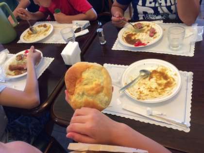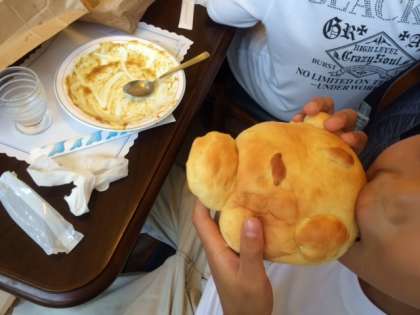 朝につくったパンが焼けました。昼食会場に持って来てくださいました。食べてもよいし、持って帰ってもよいということになりました。早速、食べでみた子どもたち。その美味しさに、にこにこ!ふわふわしていて、絶賛!半分持って帰って、おうちの人と食べるという子もいました。