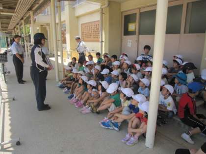 1年生の交通安全教室は「交差点の渡り方」を中心に行いました。まず,川端署の方からお話をしていただきました。次に学校から出て,2〜3人のグループを作り,実際に道を歩きました。交差点ではしっかり左右を見て,車が来ないのを確認してから渡ることができていました。今日,学んだことを生かしてくれることと思います。