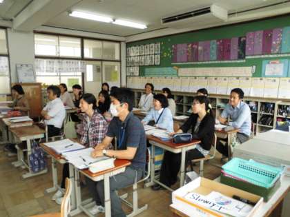 はじめは、今日の授業までの流れの説明、そして、教師相手に授業を再現してワークショップ形式の研修を行いました。