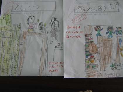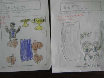探検が終わった後,教室に戻って『おきにいりのばしょ』を絵に描いて表わしました。体育館や図書室,音楽室などさまざまでした。もっともっと詳しく知りたくなったようです。