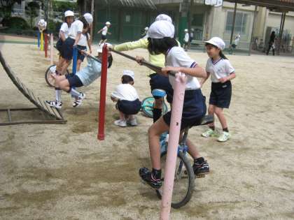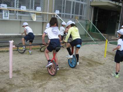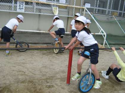 体育の学習で一輪車に取り組み始めました。中にはもうすでに一輪車に乗ることができる子どももいましたが,ほとんどの子どもたちは,「今日が初めて」とか「まだ乗れない」といった様子でした。