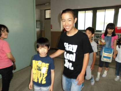 にこにこイングリッシュ1回目。1年生を教室まで迎えに行くことが6年生のまず初めの仕事でした。