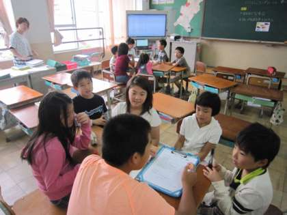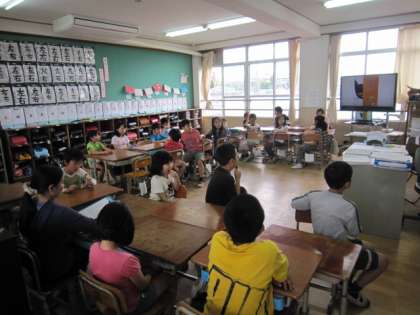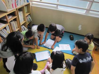 たてわり活動のグループを「にこにこグループ」と言います。1年間、異なる学年の子ども同士が支え合って活動します。今日はその1回目、「にこにこイングリッシュ」です。さっそく英語でのやり取りに挑戦して、カードを作りました。また、これからする、「にこにこタイム」での遊び方についても相談しました。リーダーの6年生は、それぞれのグループの子どもたちをまとめようと、がんばっていました。