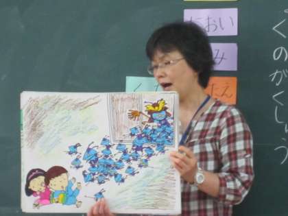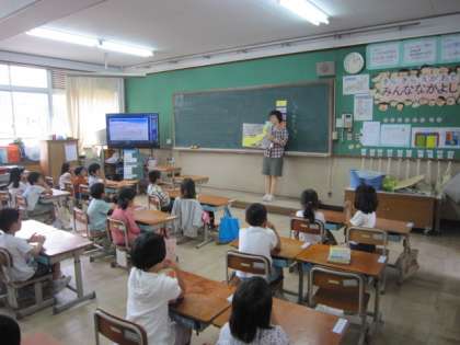 1年1組で、初めての食の学習がありました。栄養士の先生から、紙芝居を通して、野菜の大切さを教えていただきました。「ピーマン嫌いやけど、がんばって食べるよ。」と言ってくれた子もいました。いっぱい食べて、元気な子に育ってほしいです。