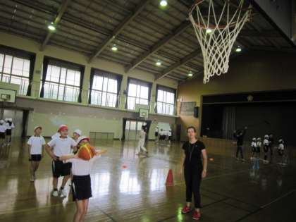 今日の1・2時間目に、5年生の子どもたちのバスケットボールの授業がありました。でも、いつもの体育ではなく、日吉ヶ丘高校のALTの先生が3名来てくださり、英語ですべての説明が行われました。子どもたちは、少し緊張しながらも、英語を耳にしながらバスケットボールを楽しんでいました。