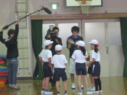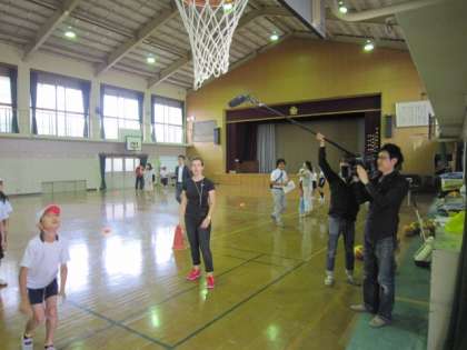 5年生の日吉ヶ丘高校のALTの先生によるバスケットボールの授業に、KBS京都のテレビの取材がありました。カメラと音声の方がいろいろな所で、子どもたちのがんばっている様子を取材されていました。今日のニュースに、その様子が映されていました。