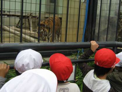 お弁当を食べ,さぁいよいよ2年生との仲良しペアになって,動物園を見学です。たくさんの動物がいました。「日向ぼっこしてるみたい」「あのお猿さんたち仲良しだね」動物のいろいろな姿を見られたようです。
