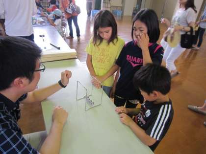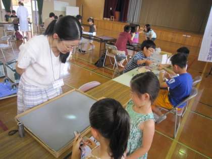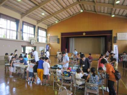 サタデースクールの取組で「おもしろ科学体験!」が行われました。京都大学からたくさんの学生の皆さんが来られて、いろいろな実験のコーナーを作ってくださいました。子どもたちは、不思議な実験を体験しながら、楽しく学んでいました。火がついたり、色がついたりなど、思いもよらないことが起ると、目を丸くして驚いていました。