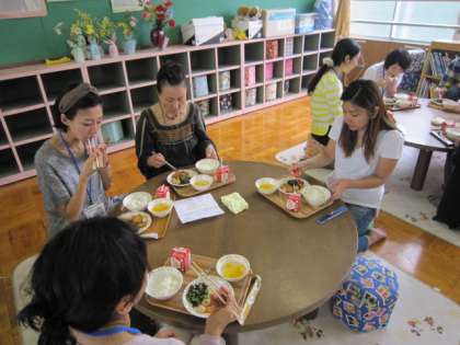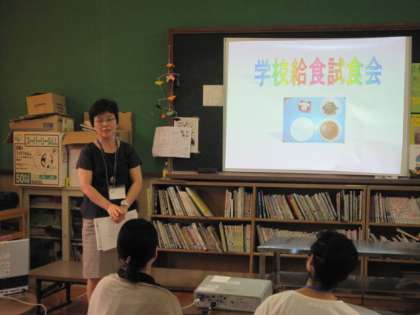 今日は、「給食試食会」がありました。はじめに栄養教諭から、給食がどのように作られているのかや、給食が工夫されている点についてなどの説明がありました。また、これから始まる「和(なごみ)の日」のことについてもお話がありました。