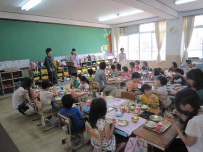 保護者の皆さんは、その後、1年生の様子を見学して、実際に給食を食べられました。今日の献立には、皆さんとても満足していただいたようで、フルーツ寒天が自然に固まる様子も見ていただきました。