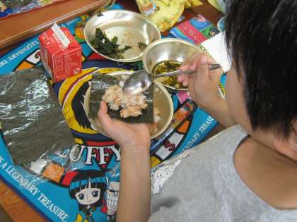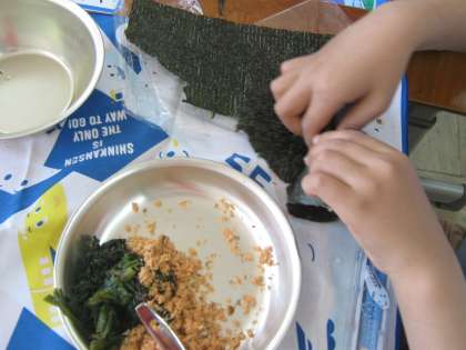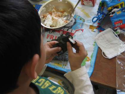 海苔にまくのが,なかなか難しい・・・。いろいろな方法で上手にまいて,大きなお口をあけておいしくいただきました。