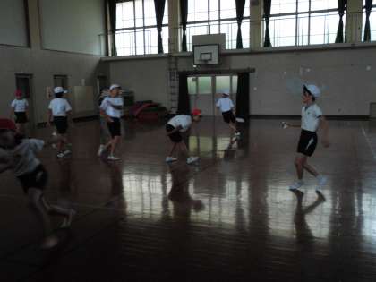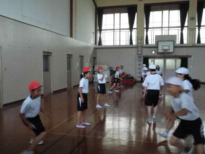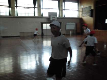 直線に並ぶ相手チームの間を通り抜けていく遊びです。