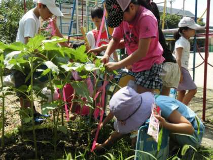 ヒマワリの葉の大きさも,子ども達の手のひらよりも大きくなり,これからどれくらい大きく育つのか楽しみです。