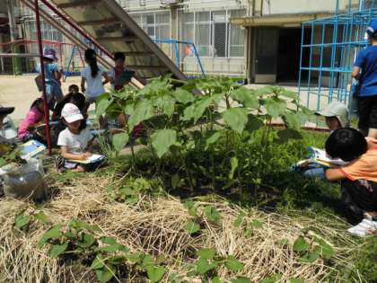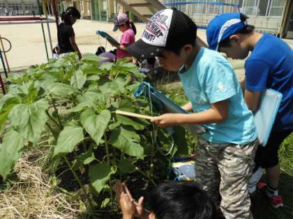ビオトープの畑で育てているヒマワリは,子ども達の腰の高さくらいまで育っています。ヒマワリは,植物の高さを,紙テープで測りとって調べました。