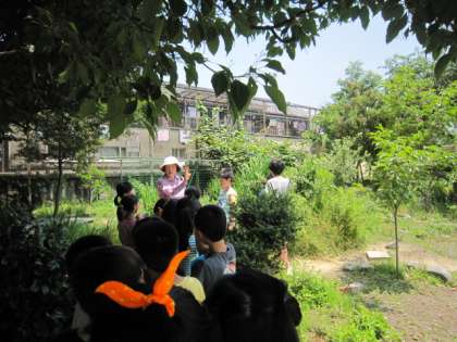 4年生は、理科の学習で四季の生き物の様子を学習します。今日は、ビオトープにいる生き物のことについて、地域のボランティアの先生から詳しく教えていただきました。