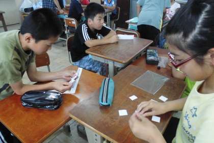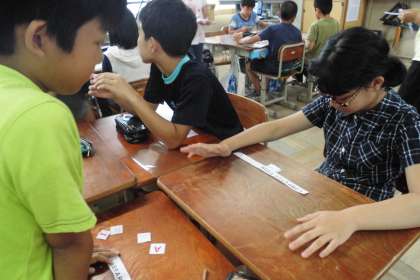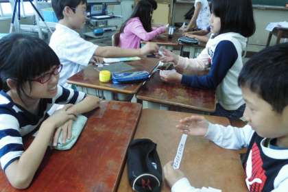外国語の学習で各教室のネームプレートを作るための大文字集めをしました。ALTの先生にも来ていただき「What do you want?」と聞かれると,「The A card pleas.」と自分の欲しい大文字を伝えるという活動をしました。集めていくと完成が近づくということで,子どもたちも楽しみながら活動していました。