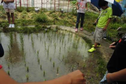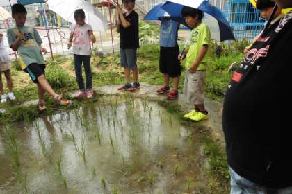 総合的な学習の時間で,お米を育てています。田植をしたら次はどうしていかなくてはならないのだろうかというところから,生育管理の話に入っていきました。子どもたちからは今後していかなくてはならないことの意見がたくさん出てきました。そのあと,植えた苗がどのくらい成長したのかを見に行きました。場所によって成長の違いも見られましたが,植えた時より大きく成長し始めている苗を見ることができました。